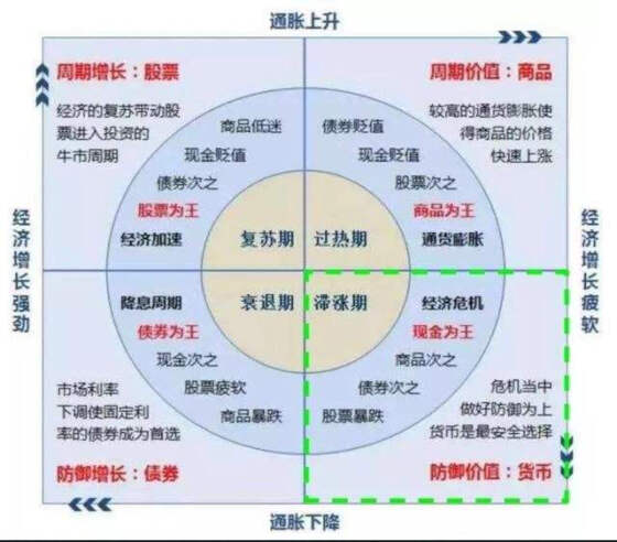 仟江水商业电讯(8月5日 北京 聪明理财)今日国信证券发布报告呼吁投资者继续做多风险资产。该机构称:当前中国经济正处于美林时钟第二象限,处在“货币+信用”风火轮第一象限。在这两个象限内,风险类资产尤其是股票资产是最值得投资人期待的。该机构认为,当前中国经济续恢复,新冠疫苗研发进展顺利,投资者对股票风险有乐观情绪。未来,股票投资应主打“内循环”主题下的结构性行情。